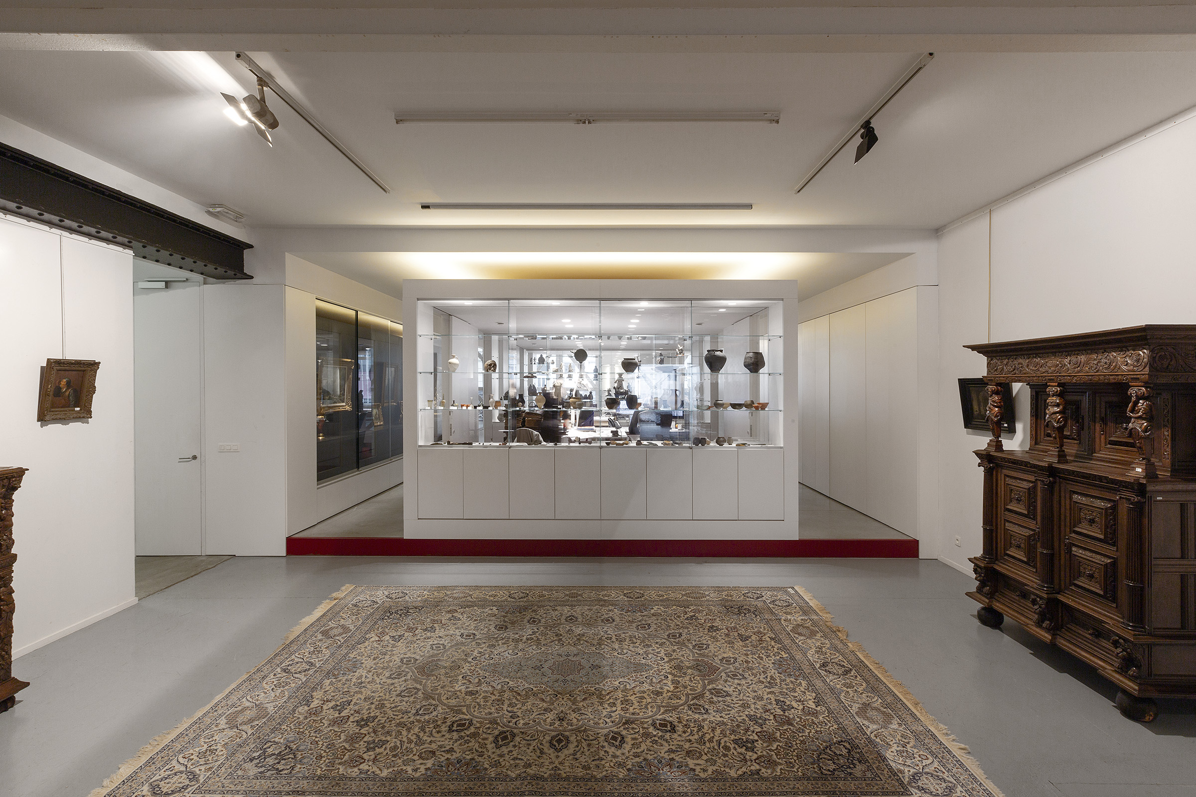 Een blokvormig volume vangt de nood aan kantoorruimte op en is als los element middenin de ruimte geplaatst. Het volume is opengewerkt met glas, waar ruimte ontstaat om te etaleren. Het niveauverschil op het gelijkvloers werd overbrugd met een podium, dat eveneens de ruimte afbakent en toelaat om deze ruimte in te richten als afzonderlijke expositieruimte.