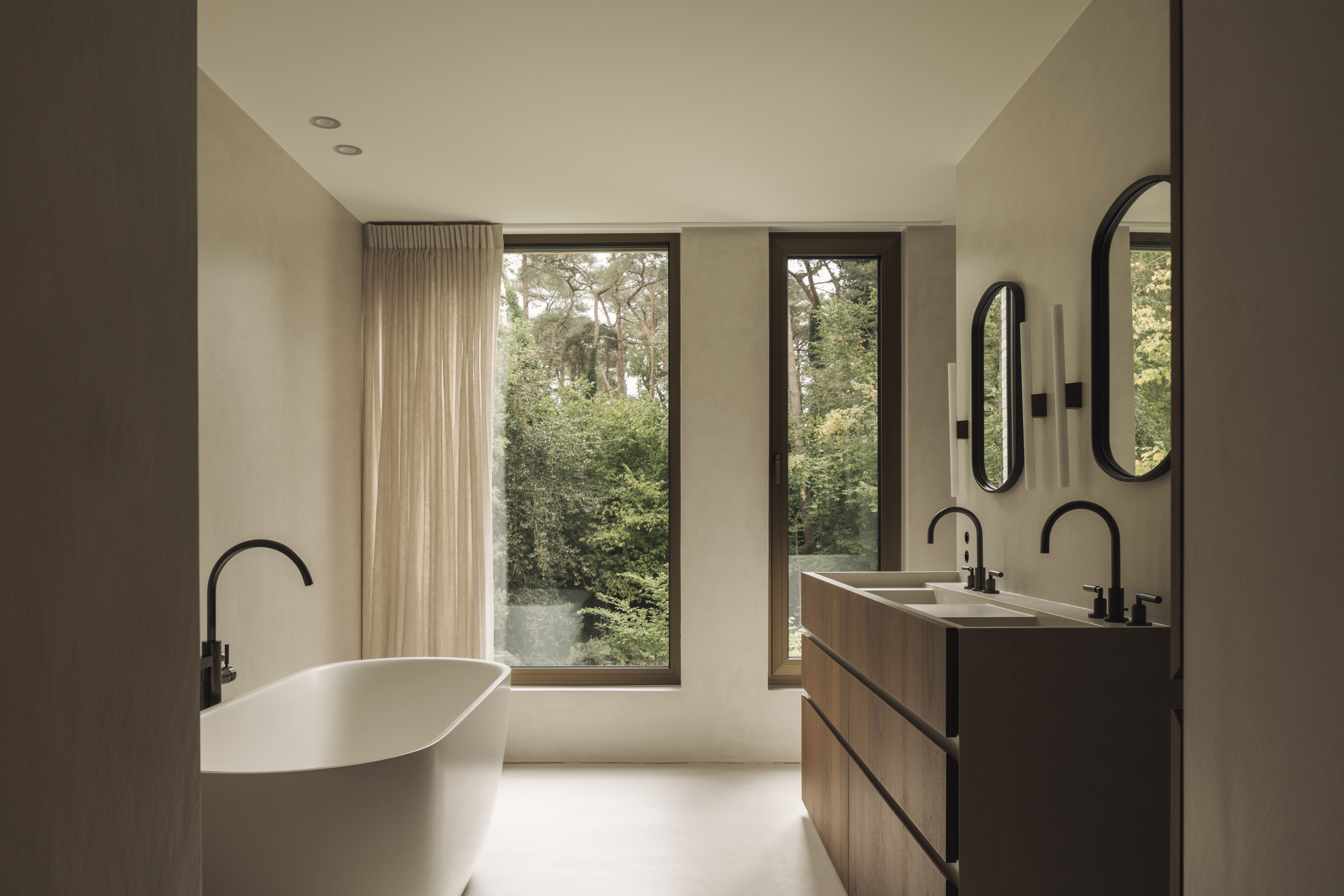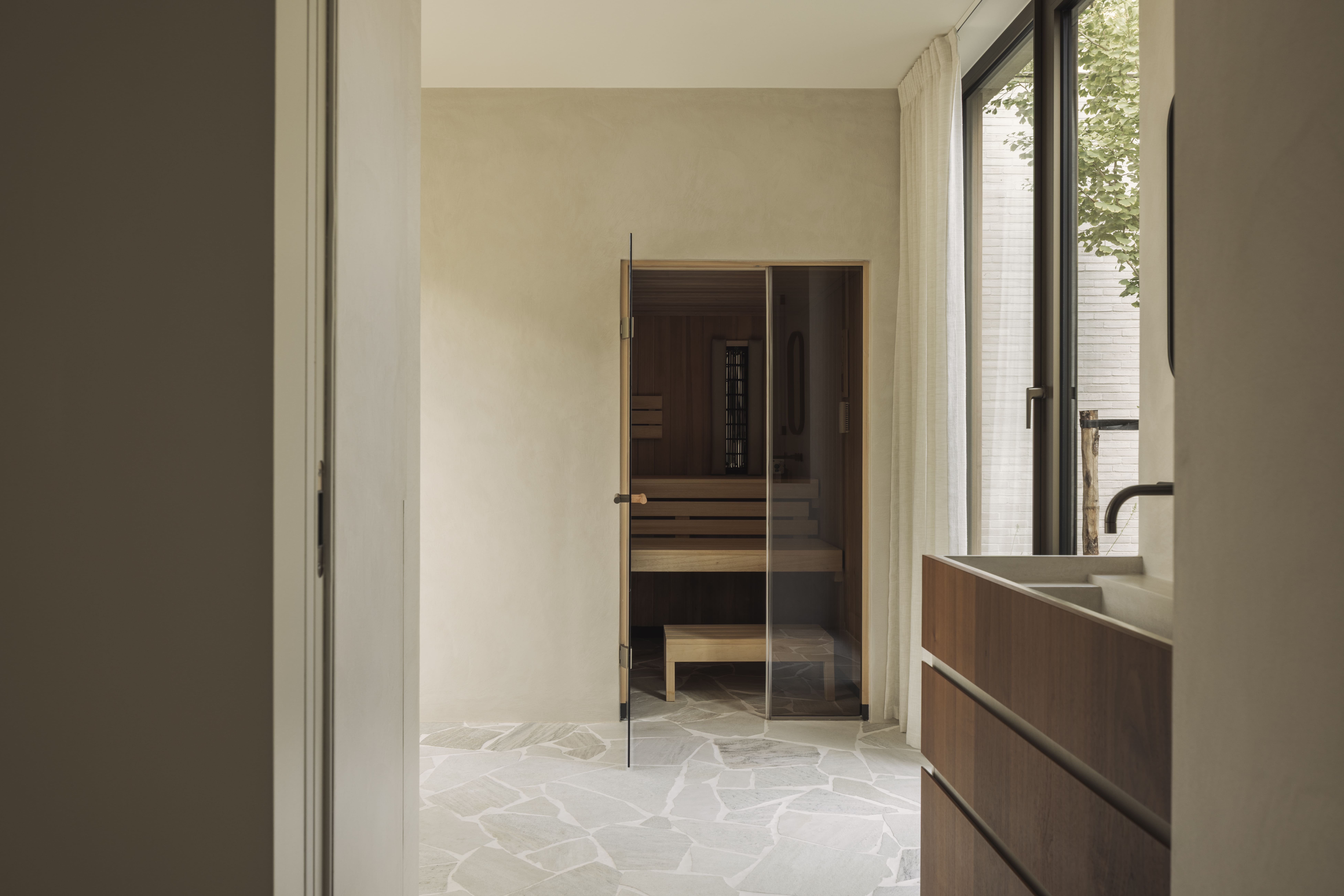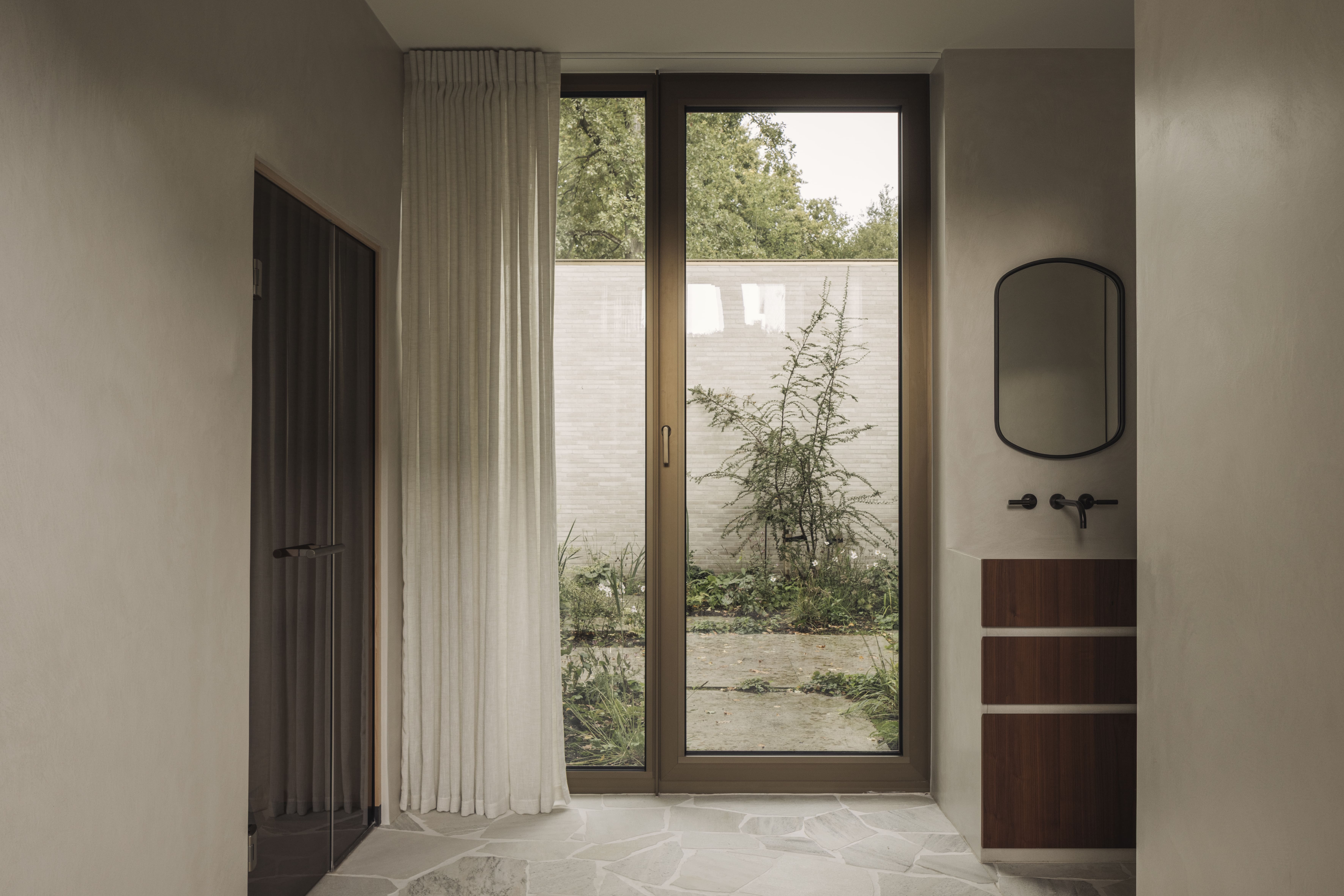 Er wordt gewerkt met een grote, groene patio die zorgt voor de connectie tussen de wellness met logeerkamer en de leefruimtes van de woning. De centrale patio laat het licht rijkelijk in de woning toestromen, zonder verlies van privacy. De combinatie van deze groene oase en het opentrekken van de achtergevel vervagen de grenzen tussen binnen en buiten.